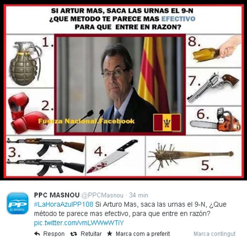 El PP del Masnou (Barcelona) se ha pasado de la ralla en su twitter colocando una imagen de artur mas con un texto que dice: "Si Artur Mas saca las urnas el 9 de noviembre, ¿qué método te parece más efectivo para que entre en razón?" rodeado de varias armas para asesinar a artur mas.